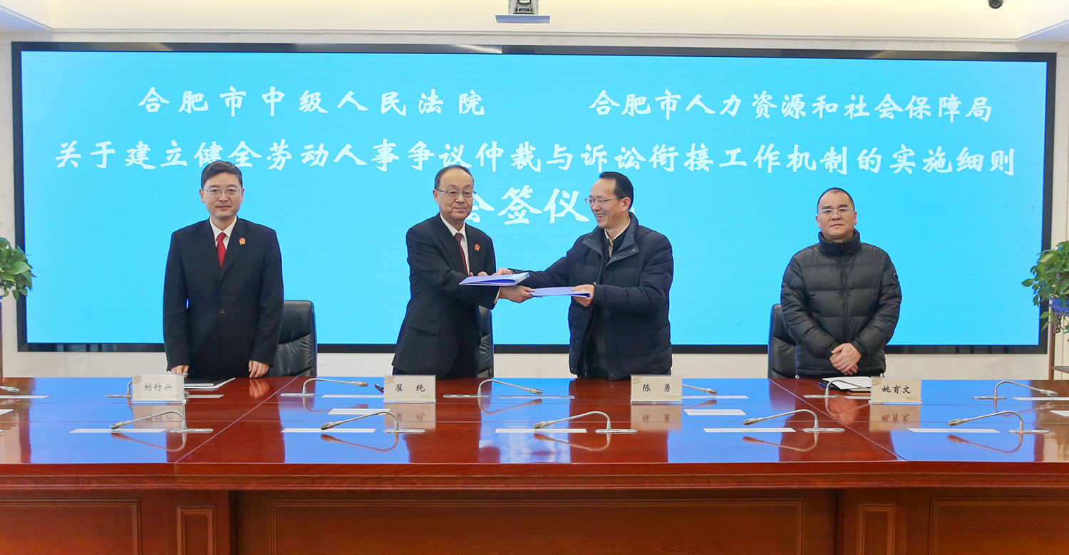 1月15日,合肥市中院、人社局联合会签《关于建立健全劳动人事争议仲裁与诉讼衔接工作机制的实施细则》(以下简称《实施细则》)。合肥市中院二级高级法官翟纯、人社局总经济师陈勇参加会签...