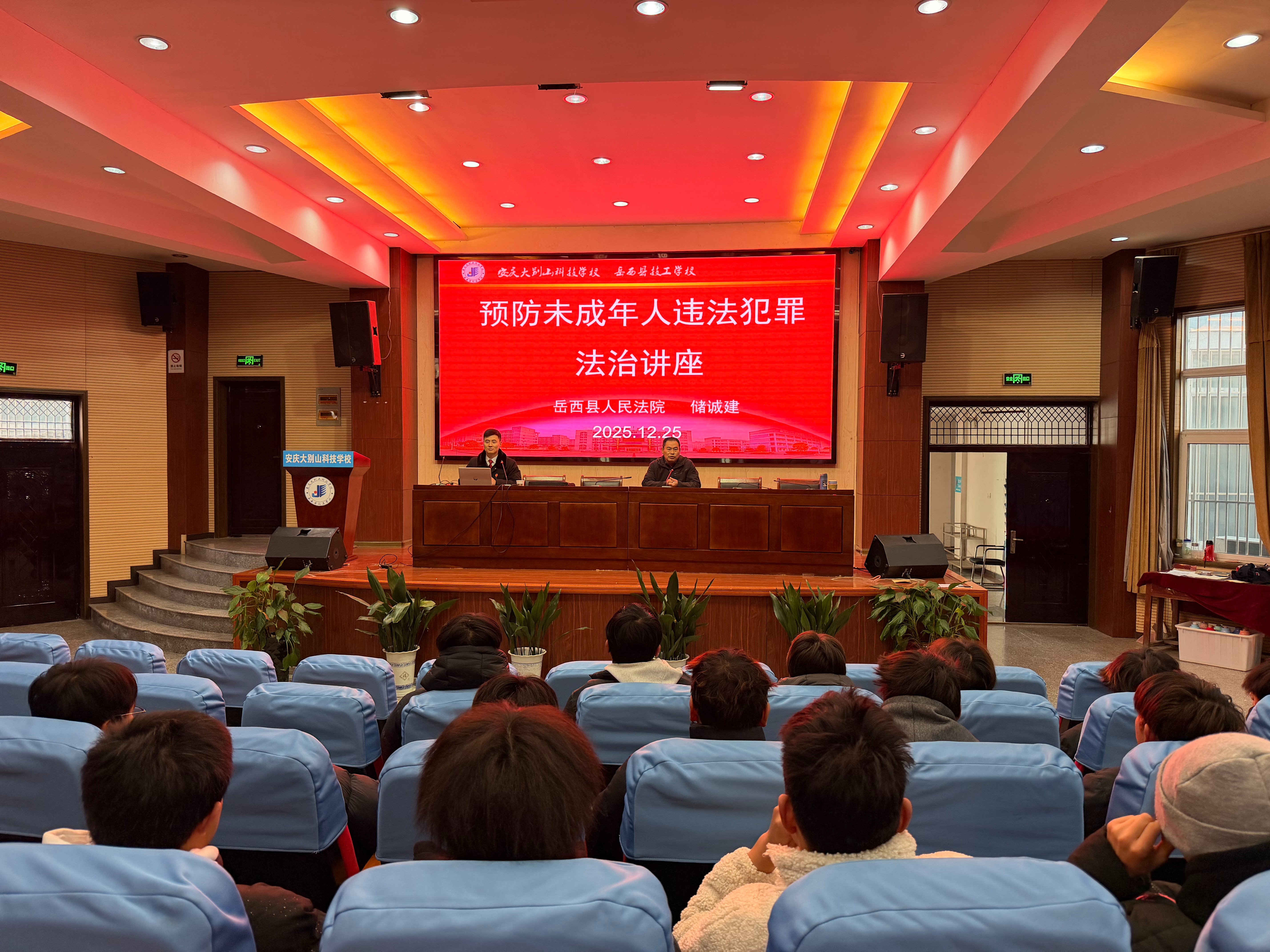 12月25日,岳西县人民法院执行局副局长、青年法官储诚建受邀前往安庆大别山科技学校,为该校高二、高三年级的同学们带来一场生动且深刻的未成年人违法犯罪预防专题讲座。