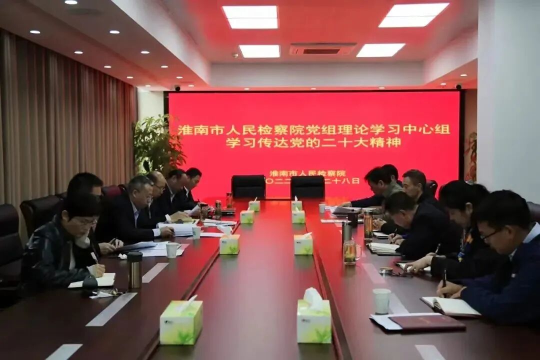 10月28日,淮南市检察院党组书记、检察长刘曙光主持召开党组理论学习中心组(扩大)会议,传达学习党的二十大精神和党的二十届一中全会公报以及最高检等上级党委、部门关于学习贯彻落实党的二十大精神的相关文件要求。会议强调,要迅速把思想和行动统一到党的二十大精神上来,做到“五个牢牢把握”,更加深刻领悟“两个确立”的决定性意义,以实际行动增强“四个意识”、坚定“四个自信”、做到“两个维护”,在党的旗帜下团结成“一块坚硬的钢铁”。要把深入学习宣传贯彻党的二十大精神作为当前和今后一个时期的首要政治任务,更自觉地在新征程上牢记、践行“三个务必”。