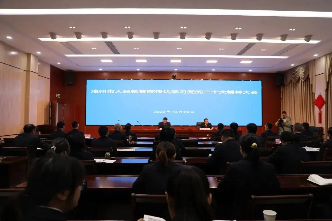 10月28日,池州市检察院组织召开全院干警大会,传达学习党的二十大精神。该院党组书记、代检察长陈勇出席会议并讲话。会议要求,要提高站位、深化认识,切实领会党的二十大的重要意义,准确把握、深刻领会党的二十大精神,切实做到衷心拥护“两个确立”、忠诚践行“两个维护”;要吃透精髓、领会要义,准确把握党的二十大的精神实质,始终在思想上政治上行动上同以习近平同志为核心的党中央保持高度一致;要加强领导、狠抓实施,深入部署、系统安排、务求实效,迅速掀起学习宣传贯彻党的二十大精神的热潮,真正做到举旗帜、聚人心、催奋进、促落实,确保党的二十大精神在全市检察机关落地生根、开花结果。