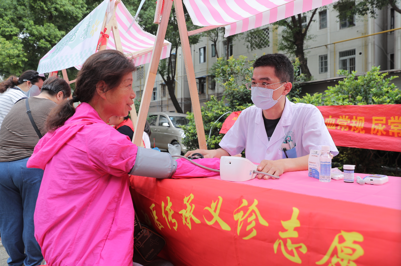 一旁的义诊台前,“合肥好人”汪飞宇带领的爱心医疗队被居民围住,量血压、测血糖,忙碌却有序。