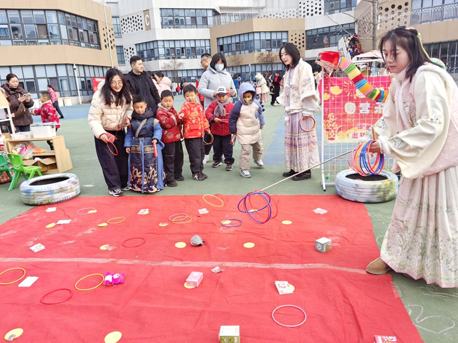 游园会的核心环节是“集五福”亲子挑战,巧妙融入多项传统民间游戏。“你抛我接”考验亲子默契,“滚铁环”唤起怀旧记忆,“抬花轿”满载欢声笑语,“投壶”“锤丸”雅趣横生,“踩高跷”“赶小猪”童趣盎然……孩子们在家长的陪伴与鼓励下勇敢尝试,成功集齐印章后欢呼雀跃。这不仅是愉快的游戏,更是一堂生动的传统文化实践课,让孩子们在亲身体验中感知年俗,理解其中蕴含的美好寓意。